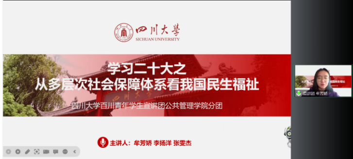 接着,百川青年学生宣讲团公共管理分团成员牟芳娇、张雯杰、李扬洋围绕“从多层次社会保障体系看我国民生福祉”深入讲解二十大精神。宣讲较为深入地展现了中国在多层次社会保障体系建设方面做出的努力及发展趋向,充分展现了中国式现代化对增进民生福祉的不懈追求。问答互动后本次团校圆满结束