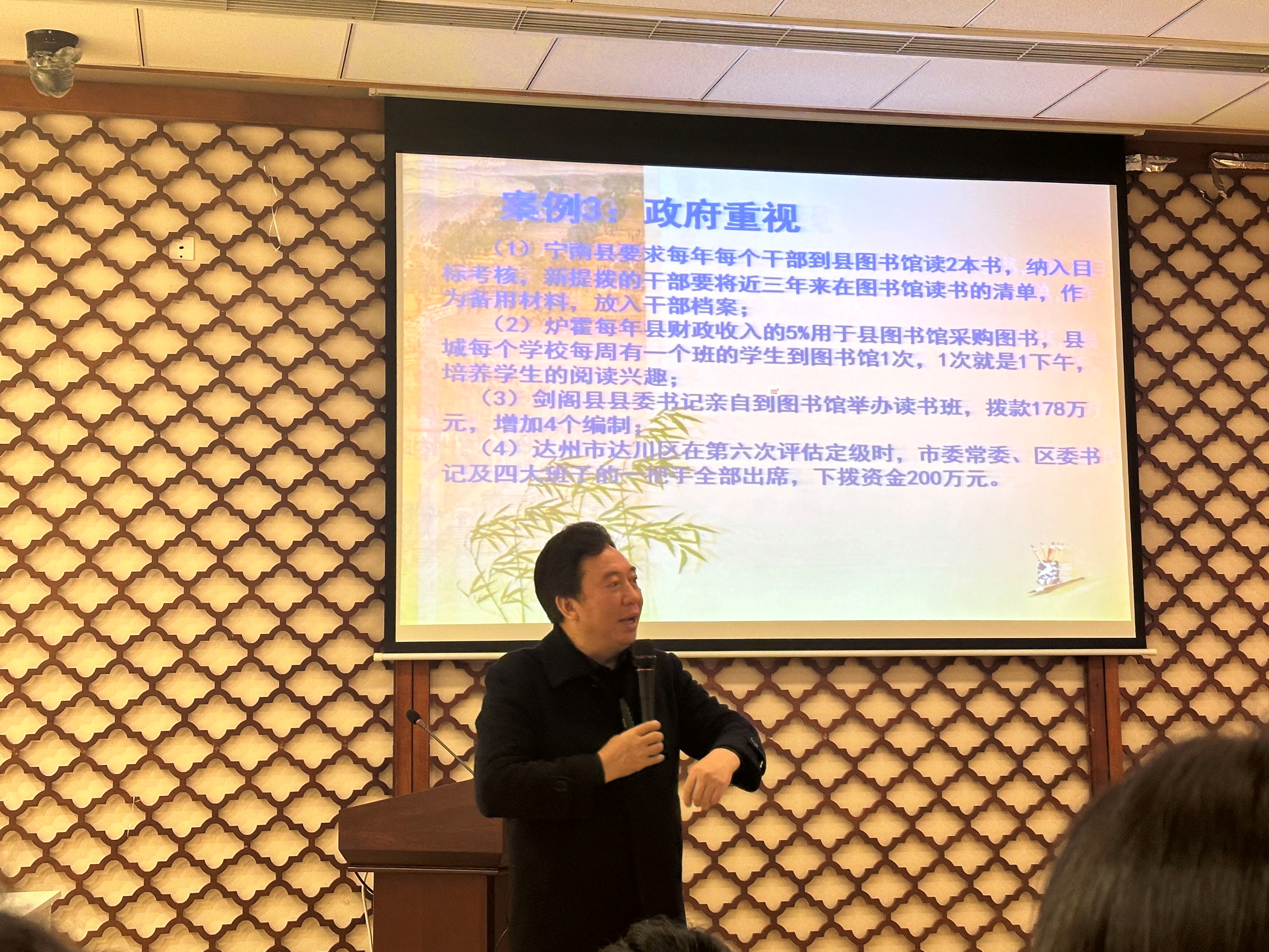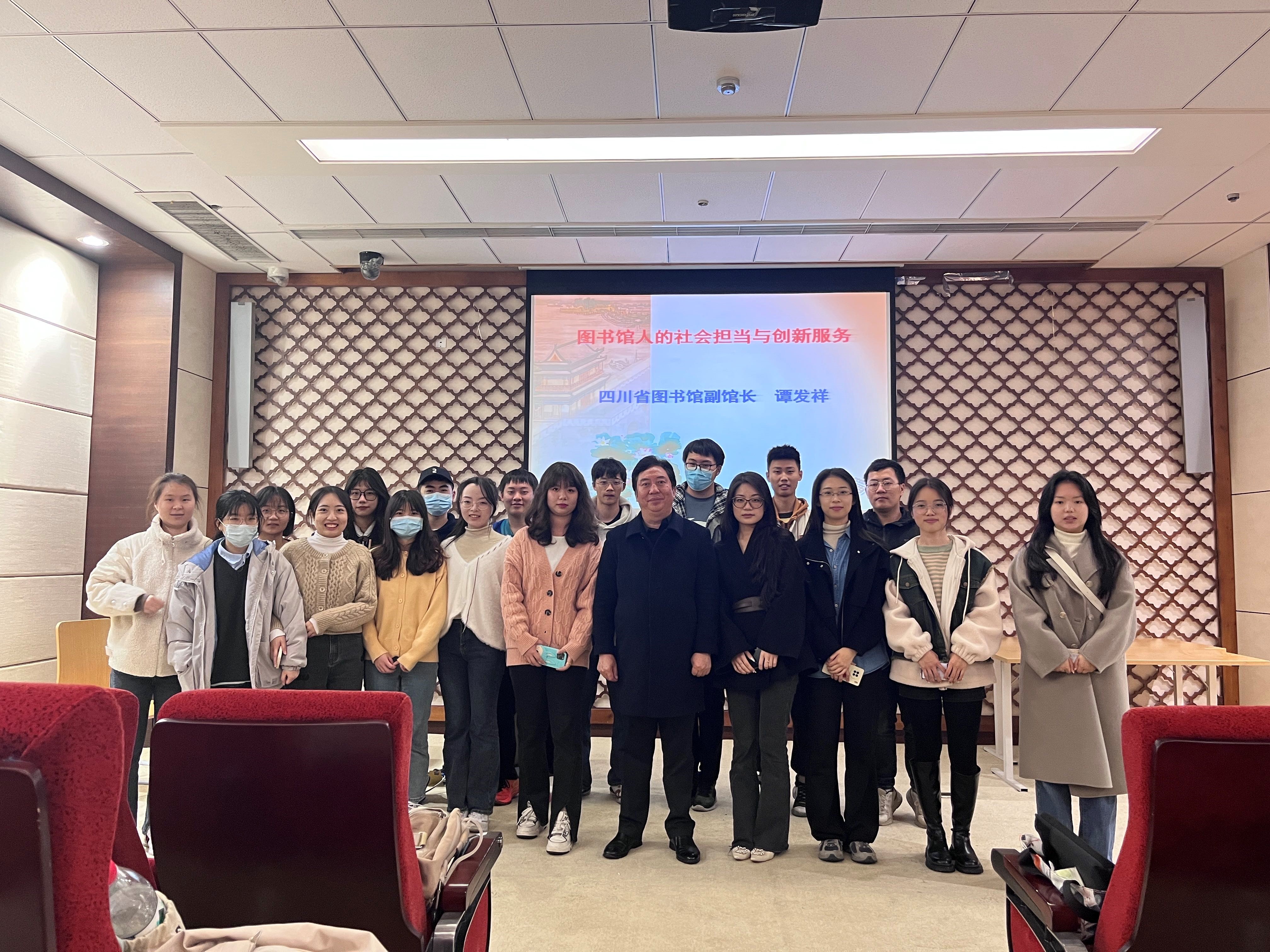 实地参观结束后,谭发祥馆长在四川省图书馆多功能厅做了题为“图书馆人的社会担当与创新服务”的学习讲座。首先,从“担当”二字说起,要求图书馆人应具有社会担当,并详细指出当今社会图书馆人应承担的7项社会责任。其次,围绕图书馆创新服务主题,从政策支持、宣传合作、数字图书馆、大数据应用等方面向同学们分享介绍了全国图书馆创新服务优秀案例。