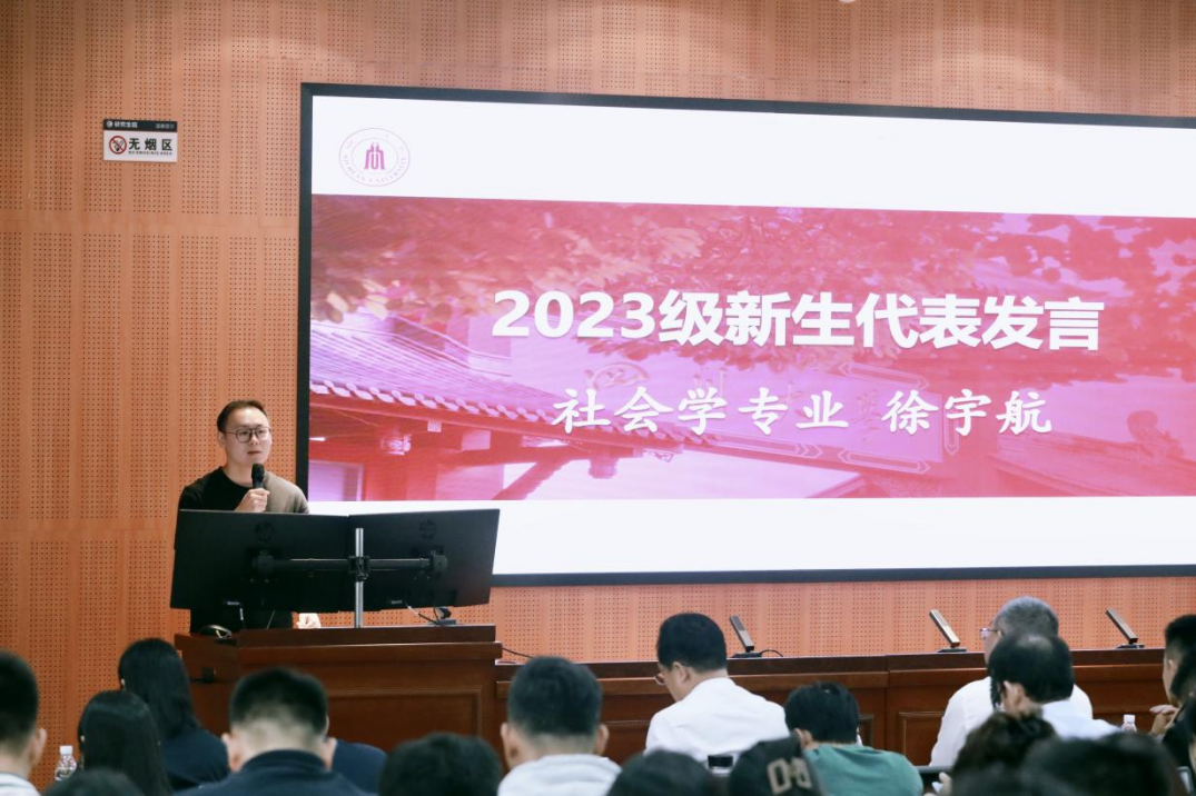 2023级社会学专业徐宇航同学作为新生代表发言。他从理想与现实、内卷与躺平、当下和未来的选择和思考中,提出明确方向,积累学术,服务社会的重要性,并与新同学们在厚植家国情怀,勇担社会责任中共勉奋进。