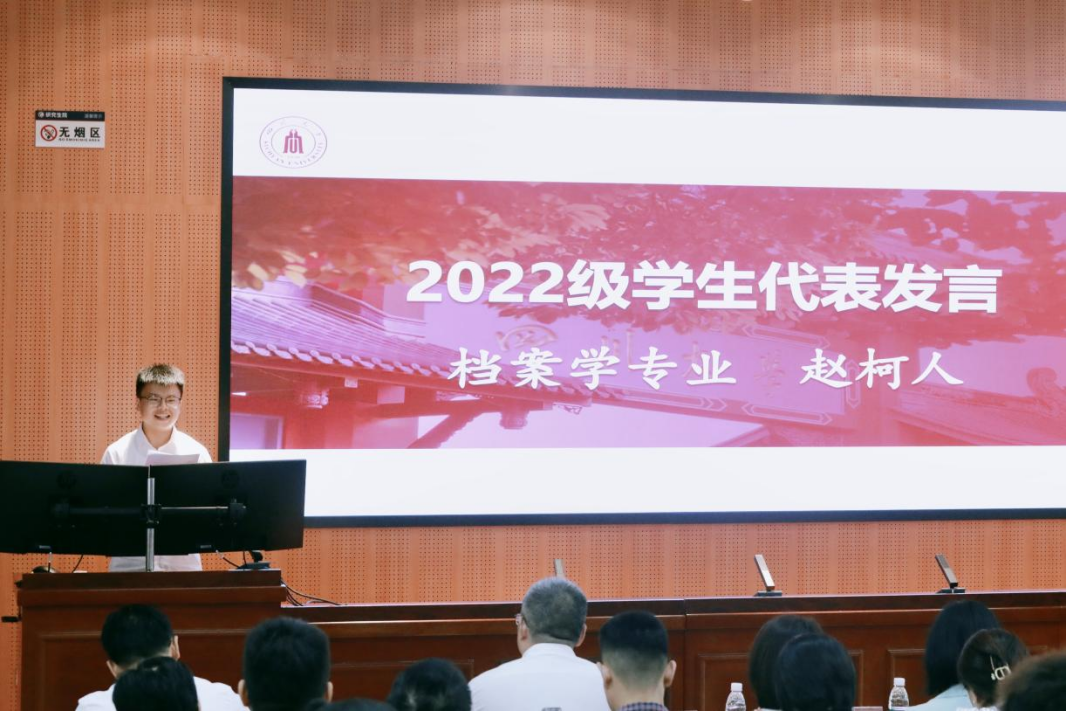 2022级档案学专业赵柯人同学作为在校生代表发言。他结合自己在研究生阶段的学习感悟,建议新同学既要慢一点、稳一点,把学问做扎实;又要钝一点、静一点,把学术道路走好,鼓励同学们在科研路上保持本心,持之以恒。