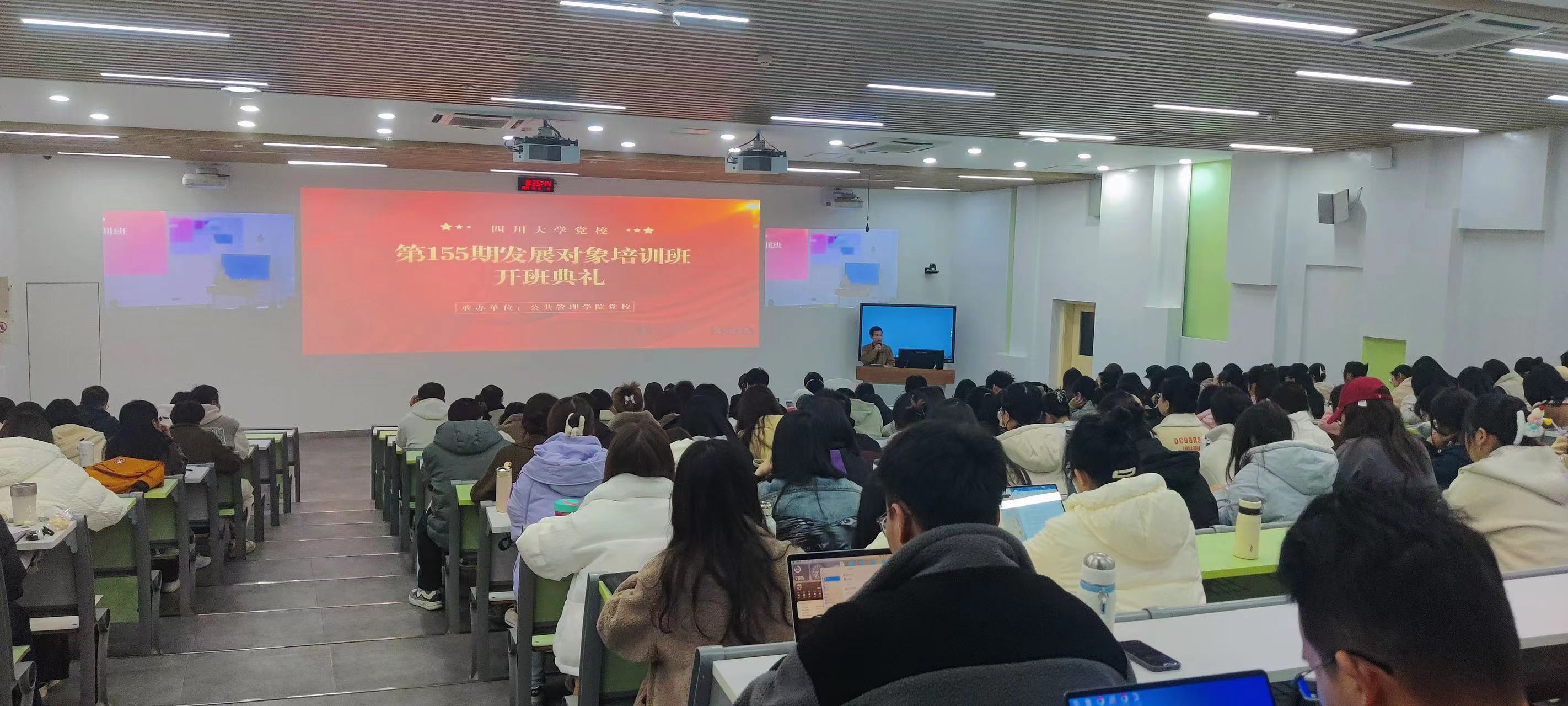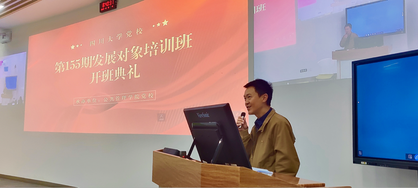12月10日上午,四川大学第155期发展对象培训班在望江校区基础教学楼C座204室举行开班典礼。此次培训班由公共管理学院党校承办,开班典礼由经济学院党委副书记兼纪委书记梁剑主持,四川大学公共管理学院党委书记韩杰、哲学系与宗教所党总支专职组织员吕蓉、公共管理学院党校指导老师付亚南、商学院党校指导老师陈启胜以及来自公共管理学院、经济学院、商学院等200余名学员出席。