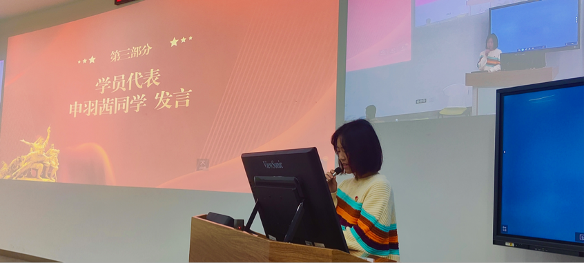 公共管理学院2021级本科生申羽茜作为学员代表发言。她表示,作为学员应在此次发展对象培训班中强化政治理论学习,提升思想道德水平,增强专业能力和本领,增优补劣,朝着优秀共产党员的方向努力。