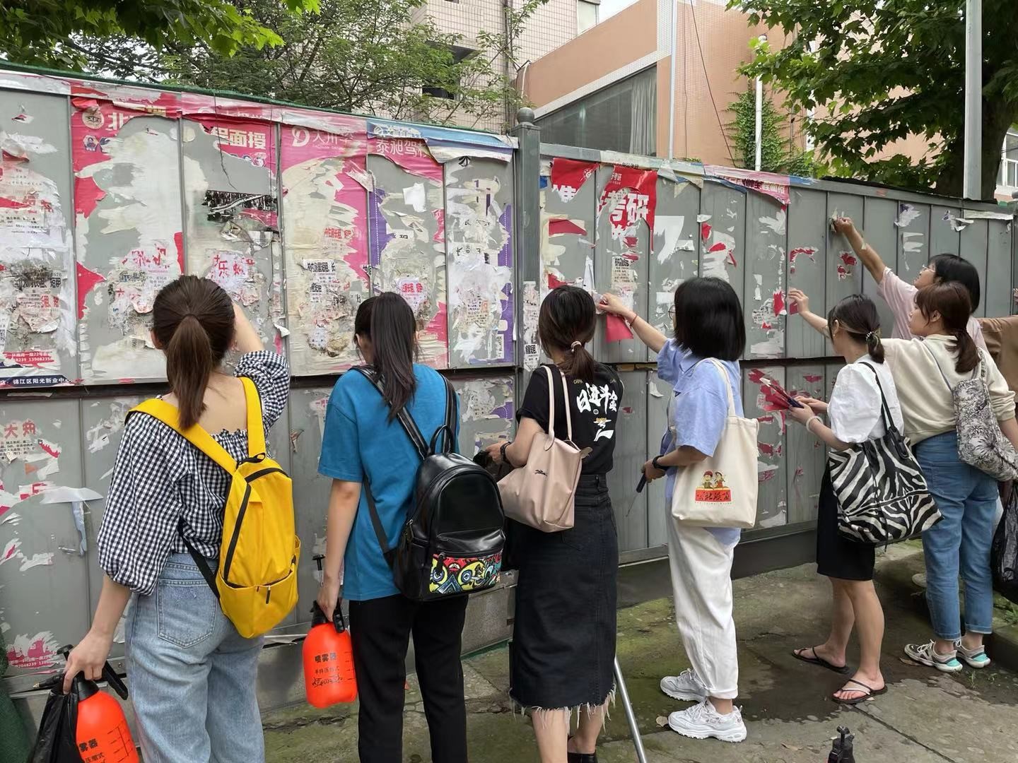 同学们分成四个小组,携带准备好的铲刀、喷壶等工具,对东苑学生食堂以及宿舍楼附近的“小广告和牛皮癣”进行清除。后勤环保队的罗老师简单地教授了同学们高效铲除的方法,并与后勤保障部杨老师共同带领同学们正式开展活动。同学们认真地清理着每一个广告和牛皮癣,对有些粘贴紧不易清理的小广告,用手将其撕离墙体,不给“小广告和牛皮癣”留下一点生存的空间。大家干劲十足、不计辛苦,经过近3多小时的辛苦劳动,东苑食堂附近的树、路灯柱及电线杆焕然一新。