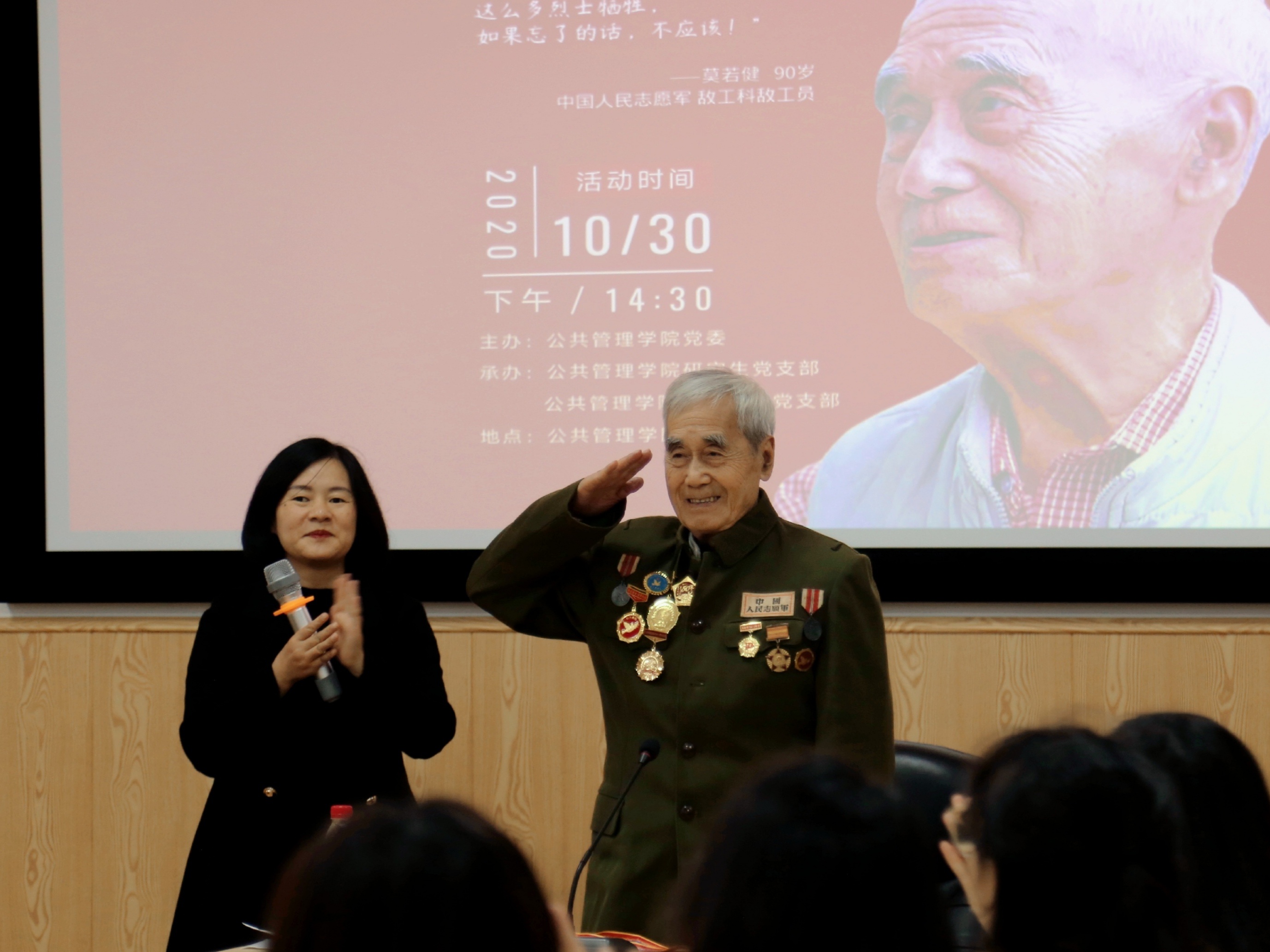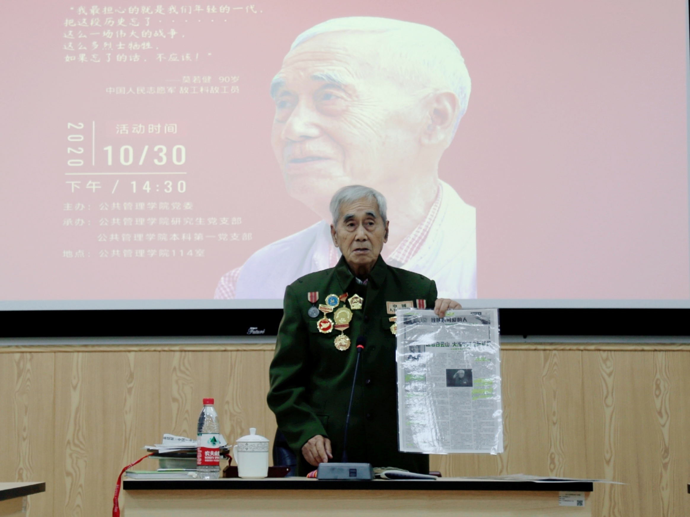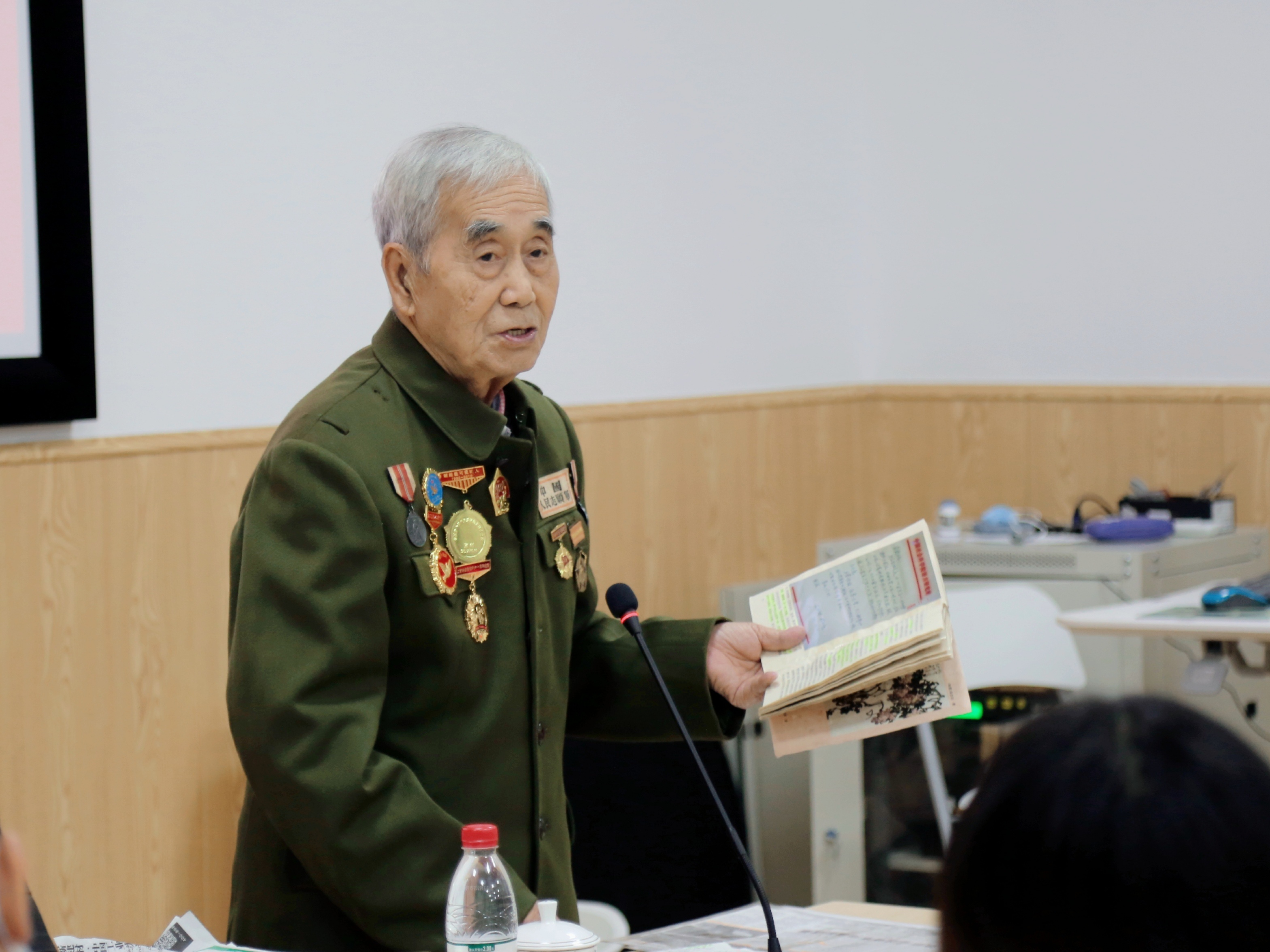 在罗亚玲副院长的介绍下,90高寿的莫若健老先生身着军装与勋功章,手拿记载他一生传奇的书籍和报纸,步伐坚定地走向讲台。站定后,莫老开心地向大家敬礼,在大家的掌声中开始了他的分享。90分钟的分享莫老全程站着讲完,动容之处不禁哽咽落泪,每一个细节都在传递着那段历史于个人于国家的重量。