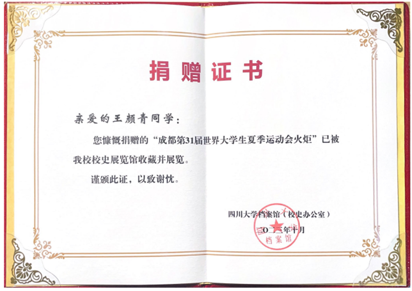 “蓉火”相传:2021级本科生王颜青向校史馆捐赠成都大运会火炬