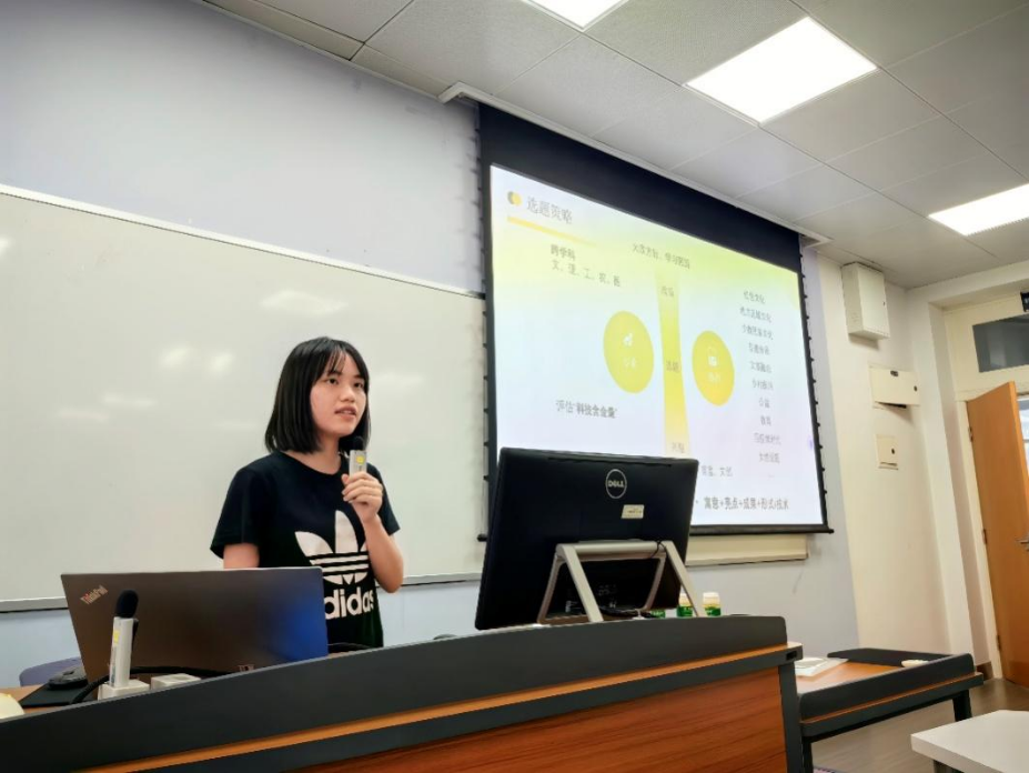 随后,兰台研习社副社长尹洁同学为学生们详细介绍了科技作品的制作过程,让同学们对科技作品的制作有了更直观的了解。尹洁同学从科研作品的选题策略开始介绍,详细从跨学科合作、大政方针、专业与热点结合等方面分享经验,同时向同学们传播了许多与小组成员、指导老师沟通的技巧,加深了同学们对科研时时间安排与交流调研重要性的理解。此外,尹洁同学也向2022级的档案学同学分享了四川大学学术科技型社团兰台研习社的情况。