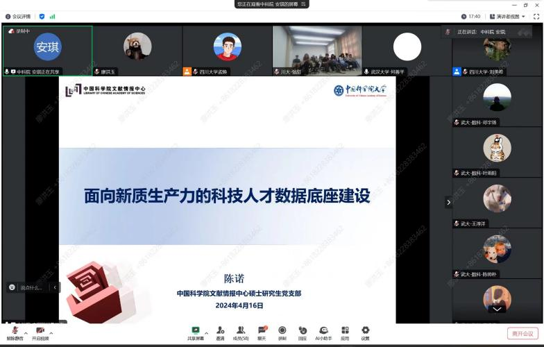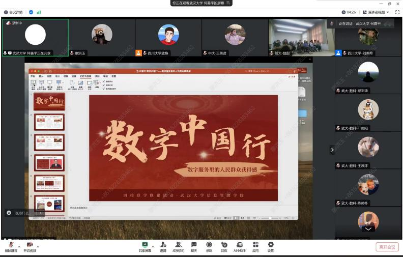 4月16日下午2:30,武汉大学、中国科学院大学、中山大学、四川大学四所高校信息资源管理学科的学生党支部相聚云端联合举办“学习全国两会“新”精神,凝聚信管党员“红”力量”主题党日。本次活动由四川大学公共管理学院研究生第九党支部支部书记孟焕主持,各支部党员分别在各自分会场参加。