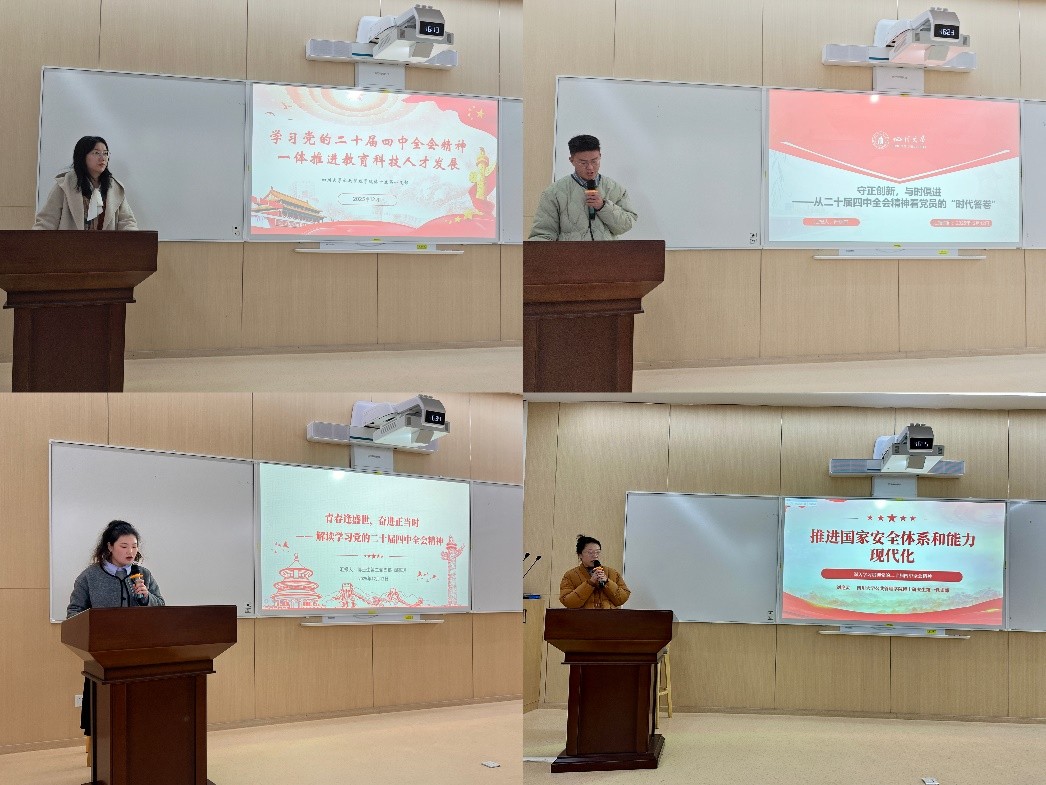 四位博士生党员代表结合专业特点与理论学习,分享会后感悟。2025级博士高霞聚焦教育、科技、人才“三位一体”战略支撑,阐释“教育奠基—科技赋能—人才反哺”逻辑,倡议党员立足专业,助力三大中心建设;2024级博士阎嘉琪紧扣“十五五”青年建功黄金期,提出以数字技术激活文化创新活力,推动个人发展与文化强国战略同频;2023级博士严林志围绕“守正创新,与时俱进”分享了如何通过守正固本、创新赋能、实干实绩做好新时代答卷人;2022级博士刘艳灵阐述了总体国家安全观的核心要义,提出了健全国家安全体系、加强国家安全能力建设、提高公共安全治理水平和完善社会治理体系的重要性。