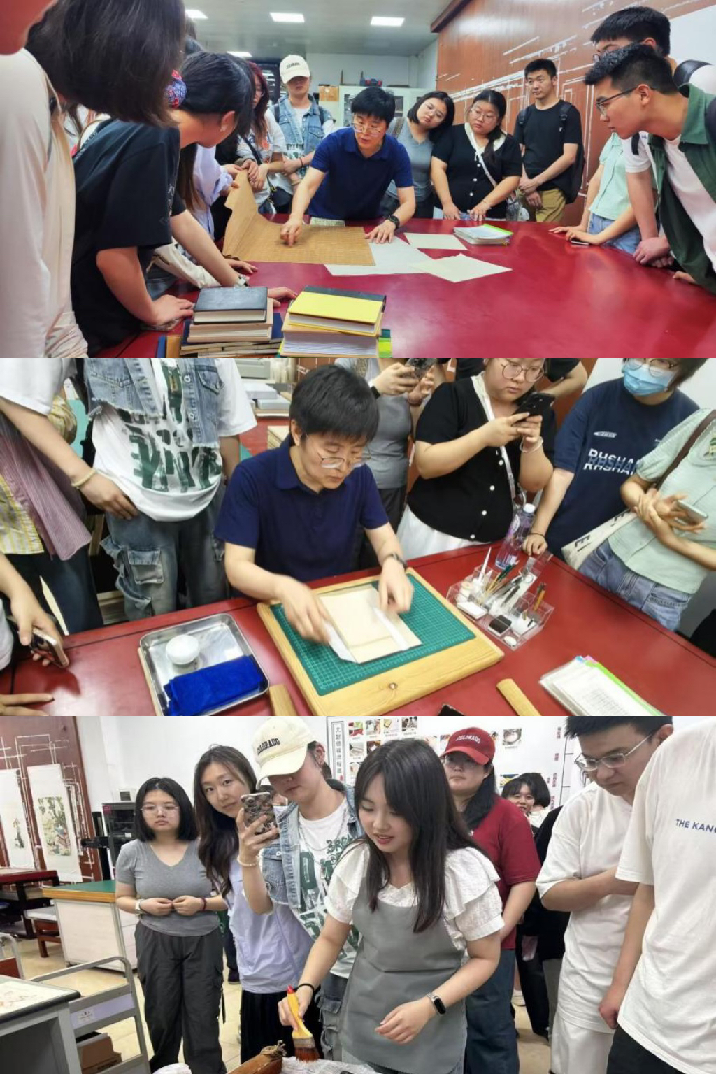 许老师展示了竹纸、麻纸、宣纸等修复用纸,并逐一讲解其产地、纤维特性与适用场景。同学们通过透光观察纸纹、触摸纤维粗细,学习辨别不同时期纸张的“体质”,了解现代修复中如何通过纸浆补纸技术实现“无痕修复”。许老师还现场演示了古籍线装的“齐栏—打眼—穿线—贴签”四步工艺。实践活动最后,同学们还分组体验了雕版印刷。